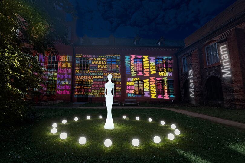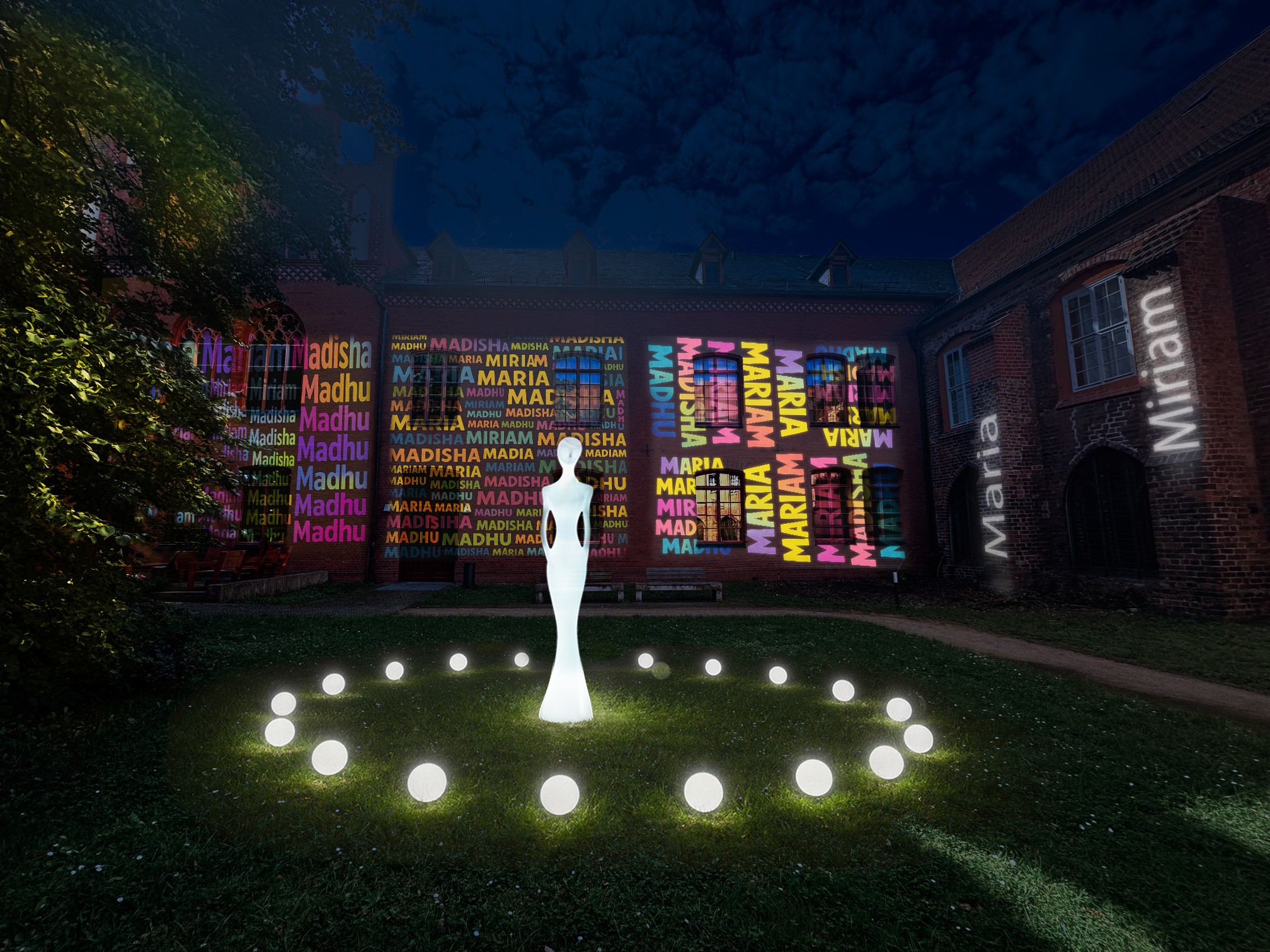 Eine Lichtinstallation zur Jahresausstellung „Mythos Maria“: Maria begegnet man überall auf der Welt, auch da, wo man sie nicht vermutet. Für ihre Anziehung steht nicht immer die Religion im Vordergrund, oft übt sie im Alltäglichen, abseits des Heiligen, ihre Faszination aus. Maria gehört allen und niemandem, jeder sieht in ihr etwas anderes, sie ist heilig und profan zugleich. Was Maria zu Eigen ist, was sie symbolisiert, kann jeder verstehen, unabhängig von seiner Herkunft und Religion. Sie ist Aller Welts Maria, und das symbolisiert die Künstlerin mit einer weißen Lichtgestalt ohne Gesicht und mit verschiedenen Namen aller großen Weltreligionen für diese eine besondere Frau, in der jeder etwas anderes sieht, die aber für alle eins bedeutet: Glaube, Reinheit und bedingungslose Liebe.