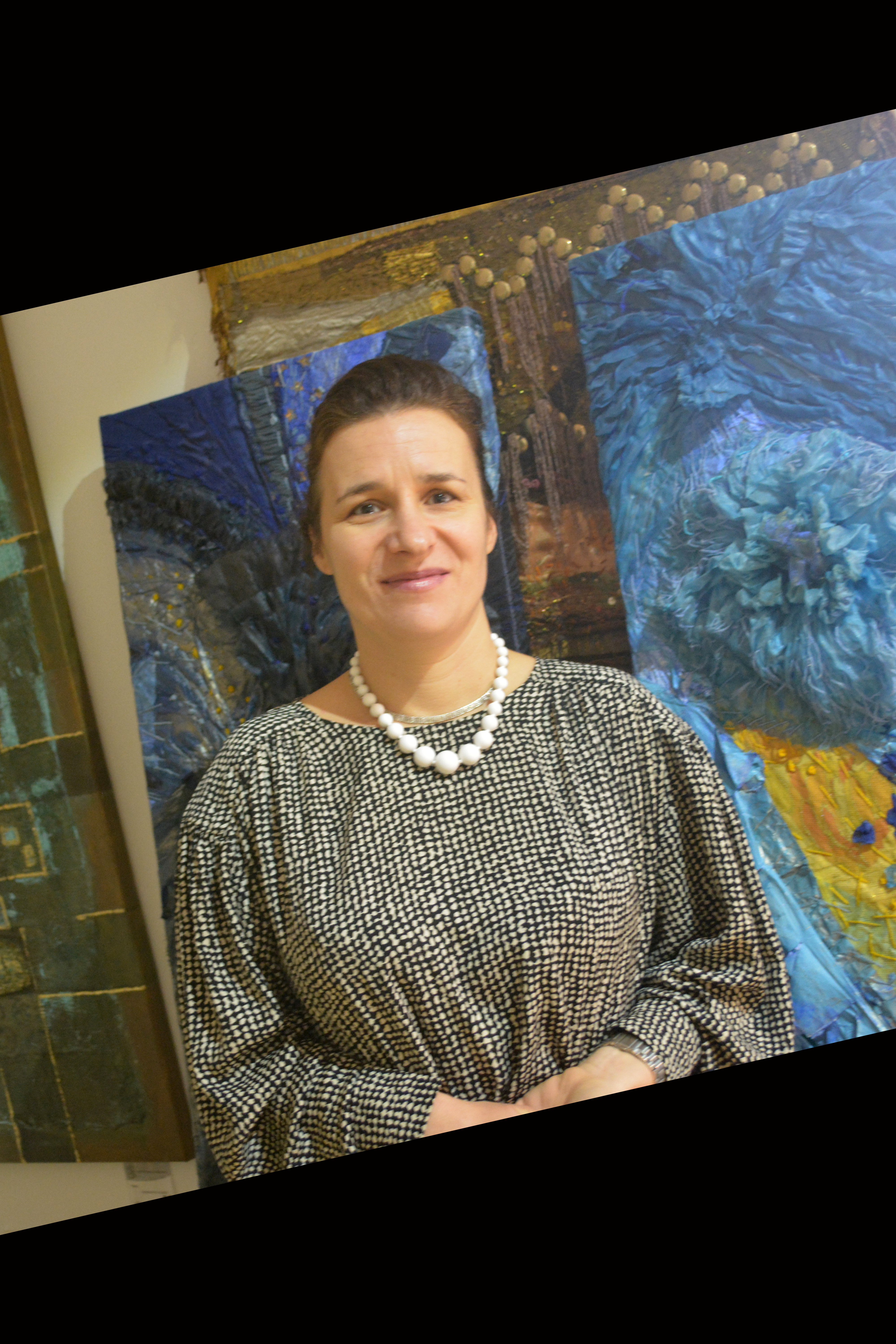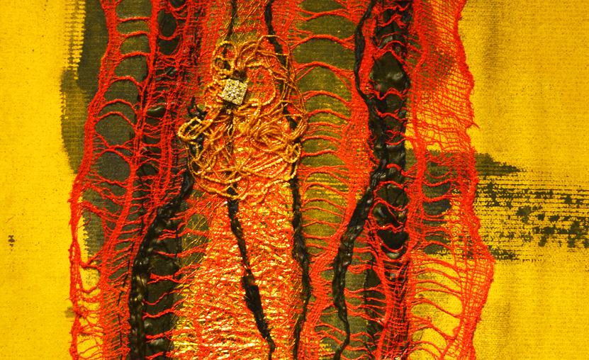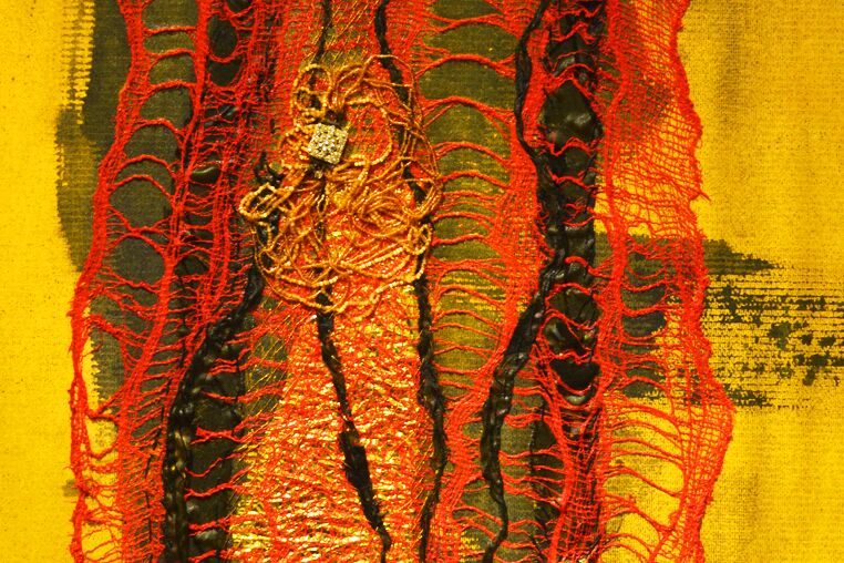 Kontrasten, um einen sicheren Plan zur Bildgestaltung zu haben. Anschließend verarbeiten wir stoffliche und andere Materialien, die sich mit Nadel und Faden verbinden lassen und befestigen sie auf Leinwand (Nähen und Kleben). Zum Ende wird das Bild mit feiner Lasurmalerei überzogen.