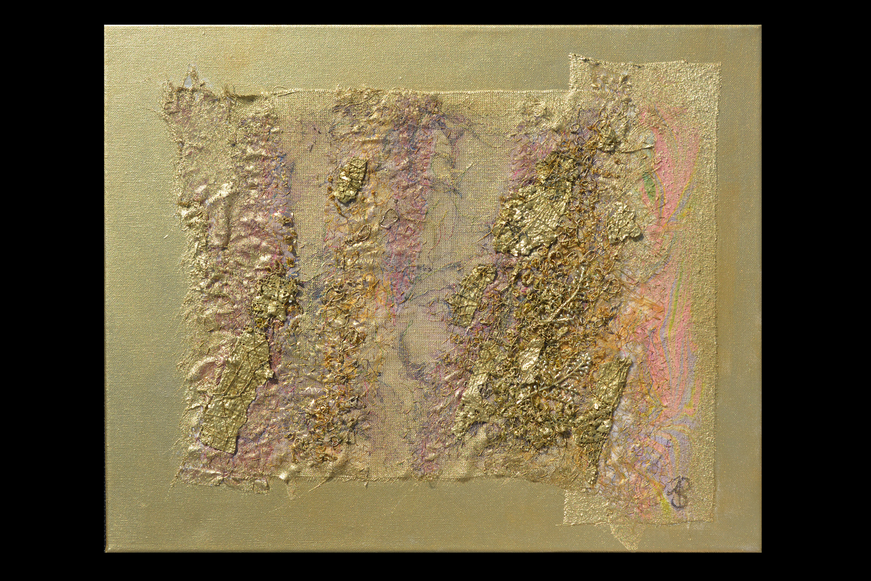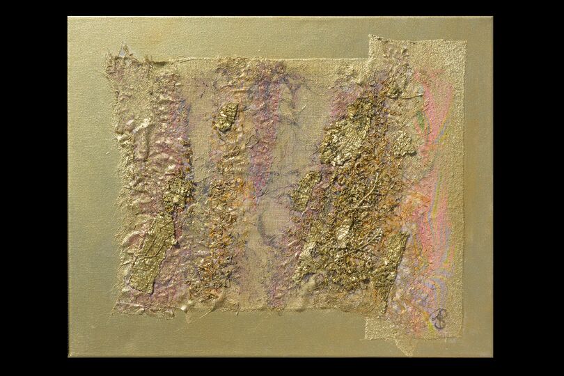 Materialien der Workshop-Leiterin: Einfache Leinwände A3 von Boesner („Go Create“),1 Kiste mit Strukturstoffen, Silber-/ Goldacrylfarbe (Boesner), einfaches Gelmedium, Tacker