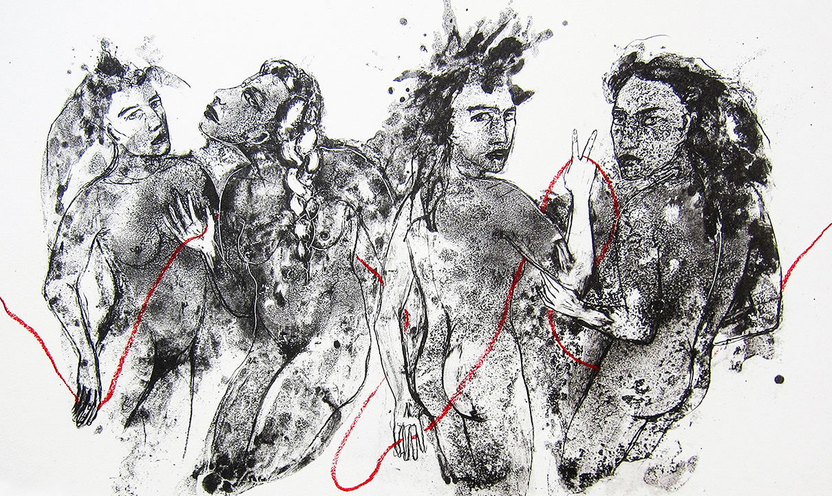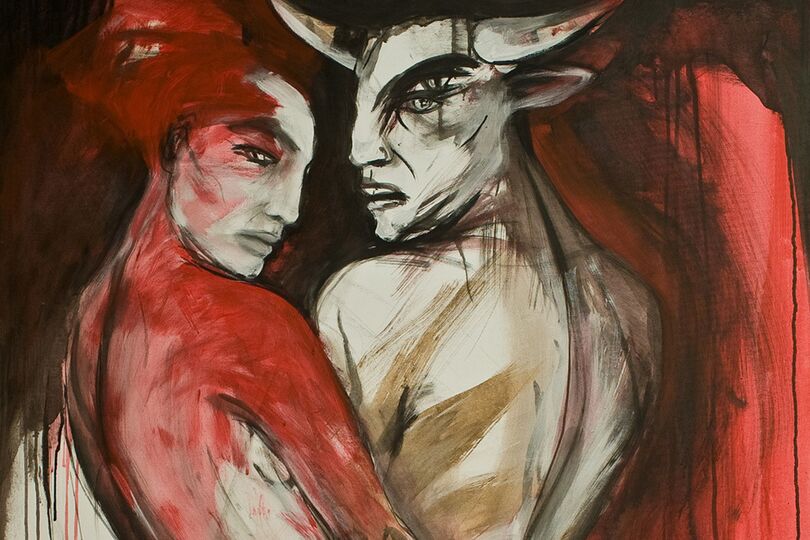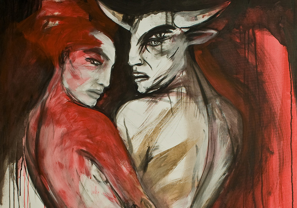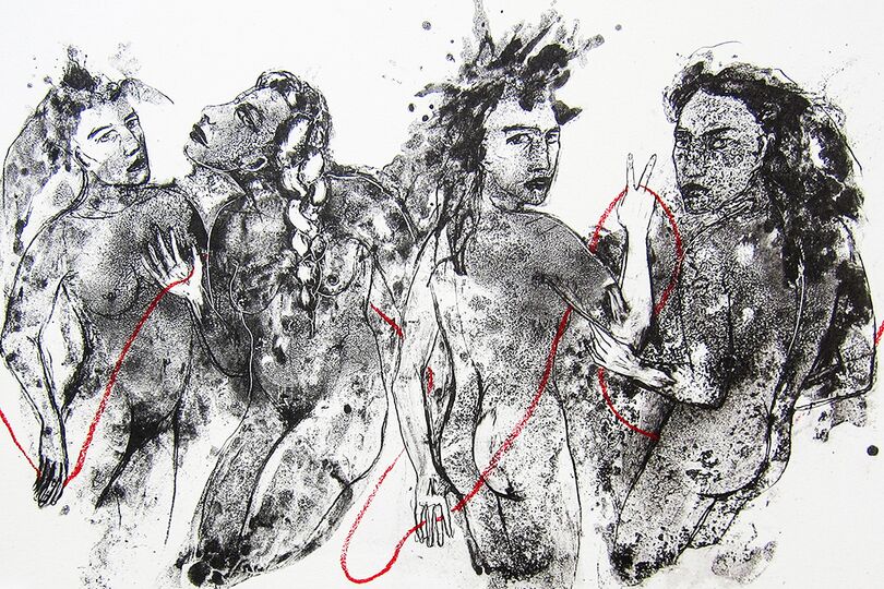 Die im allgemeinen Sprachgebrauch verfestigte Redewendung vom „roten Faden“ bezeichnet eine Richtlinie, einen kontinuierlichen Weg und erzeugt Assoziationen, welche in treffender Weise das Werk der Dresdener Künstlerin Angela Hampel charakterisieren. Seit 1982 arbeitet die Dresdenerin als freischaffende Künstlerin und fand schon in dieser frühen Zeit zu ihrem komplexen Thema der Darstellung von Paaren, von Varianten bzw. Spielarten der Partnerschaf. Ohne sich der Gefahr von inhaltsleeren Wiederholungen auszusetzen, überrascht die Künstlerin immer wieder in der Auslotung des Neben- und Miteinander von Menschen, Tieren und Pflanzen - erfundene Konstellationen als Resümee intensiver künstlerischer Selbstbefragung. Dieser „Grundsound“, vorgetragen in einer farbgewaltigen, expressiven Malerei oder in Grafiken mit meisterlichen Hell-Dunkel-Nuancen aufgezeigt, fand von Anfang an nationale und internationale Beachtung und wird seit Jahrzehnten in einer stringenten thematischen Kontinuität gepaart mit höchstem künstlerischem Anspruch weiter ausgedeutet.