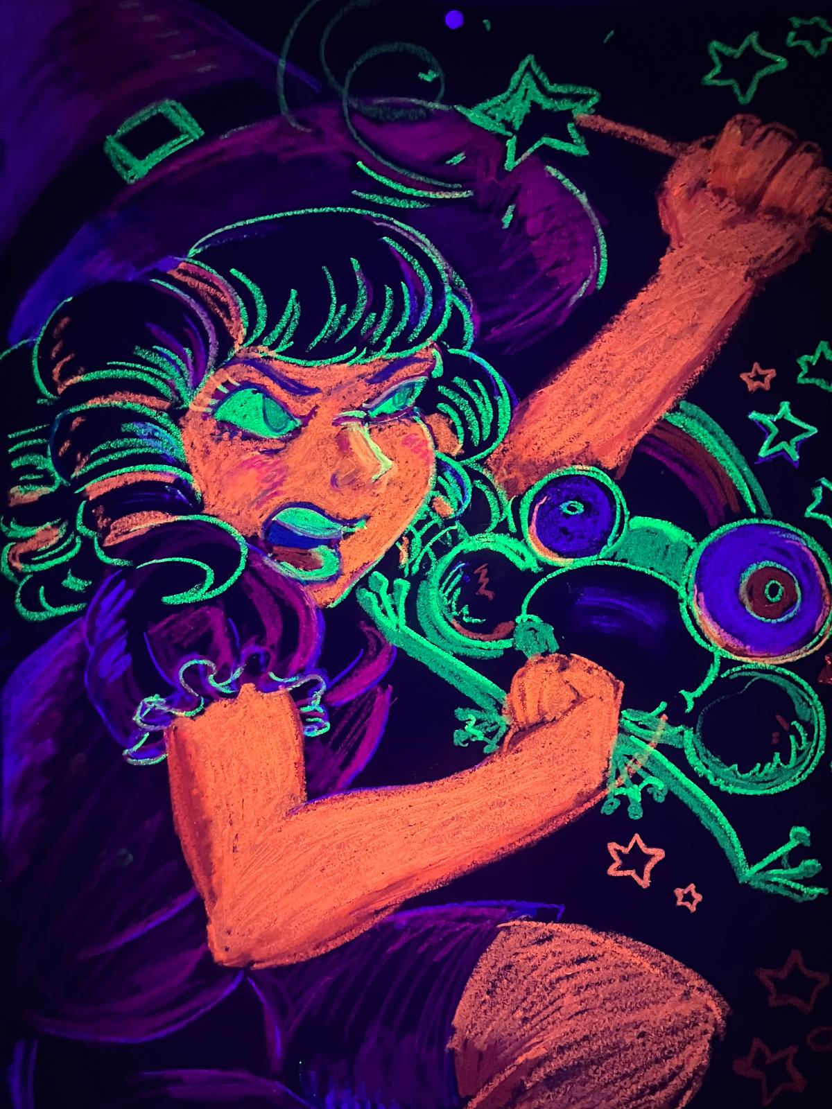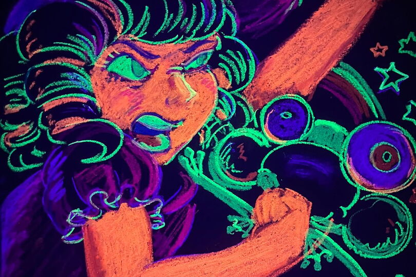In der Dunkelheit der alten Kapelle erwartet die Besucher eine besondere Kunstausstellung mit leuchtenden Hexenwerken, die in den Kursen der Wredow-Kunstschule entstanden sind. Das Besondere: in diesem Jahr wurden viele Bilder der großen und kleinen Künstler mit UV-Farbe gemalt - für die besondere Wirkung im Schwarzlicht. Wer will, probiert sich mit solchen Farben gleich vor Ort aus. Die zauberhaften Mitmach-Angebote, Spiele und das Kinderschminken gestaltet der Kunst-Praxis-Kurs der 10. Klasse des Domgymnasiums.