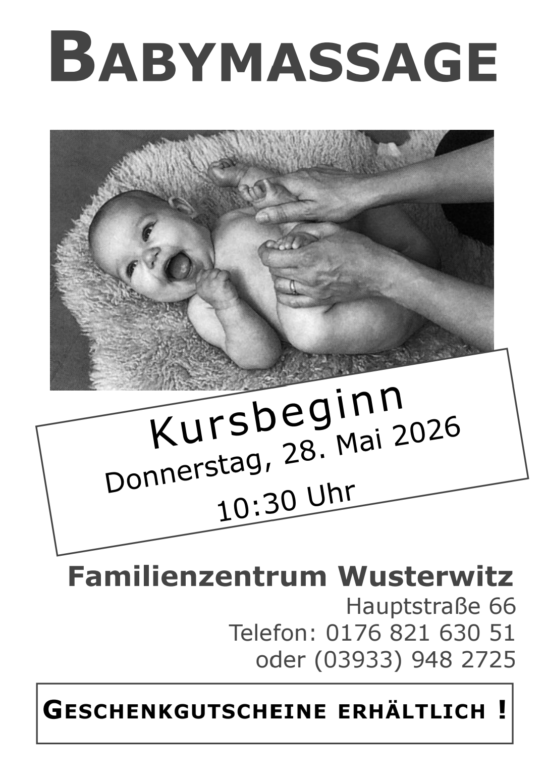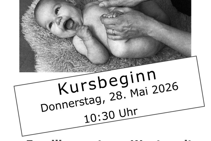 Die Babymassage findet heute und 4. Juni im Zusammenhang mit dem Familienfrühstück im Familienzentrum statt. Nach dem Frühstück können die Babys massiert werden.