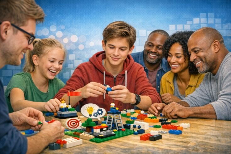 Teilnehmende bauen in einem moderierten Workshop mit LEGO‑Steinen Modelle, um Gedanken, Ideen und Zusammenhänge sichtbar zu machen.