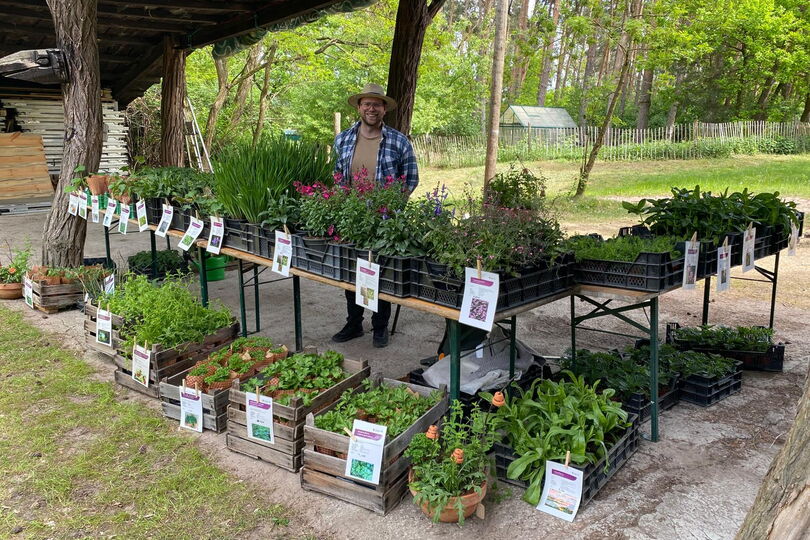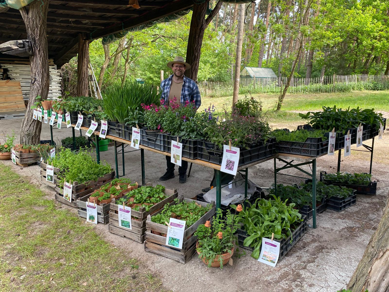 An drei Samstagen der Offenen Gärten findet bei uns ein Gartenmarkt der Fliedners Lafim-Diakonie statt. Hier gibt es ökologisch produzierte Beet- und Balkonpflanzen, Kräuter, Baumschulware, Stauden und Jungpflanzen. Außerdem bietet der Stand liebevoll zusammengestellte saisonale Gestecke und Blumensträuße.