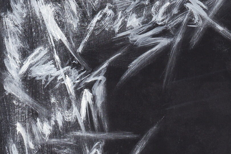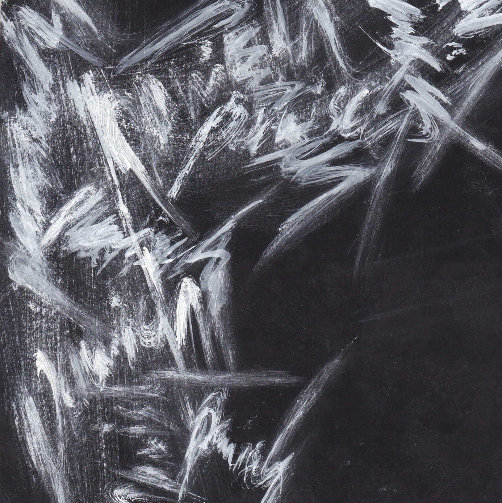 Ein einziges Wort. Das Wort stammt aus der Whitebox – Message to White. Es wird gezogen oder gewählt. Dieses Wort nimmt Gestalt an. Mit Pinsel und Farbe. Mit Feder und Tusche. Mit Kreide. Alles weiß. Auf farbigem Grund. Form, Rhythmus und Spur