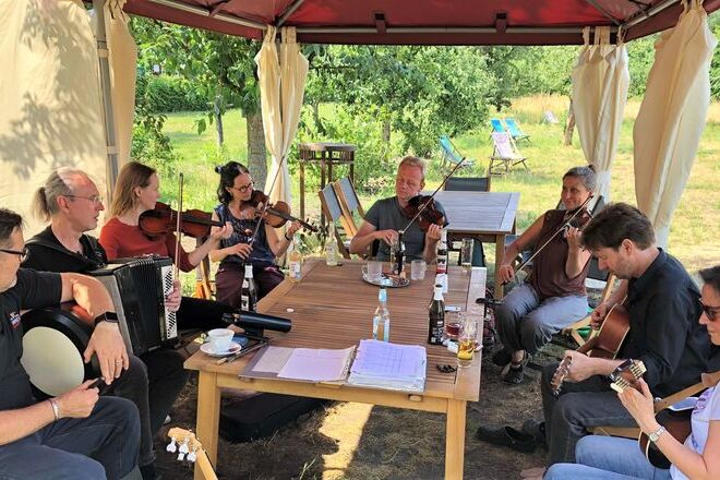 Neuigkeiten werden ausgetauscht. Plötzlich wird es still, weil ein Lied angestimmt wird. Die Potsdamer Session spielt seit Herbst 2002 regelmäßig in Potsdam und Umgebung, immer von Musikern, die sich intensiv mit der irischen Musik beschäftigt haben und sie authentisch zum Klingen bringen.