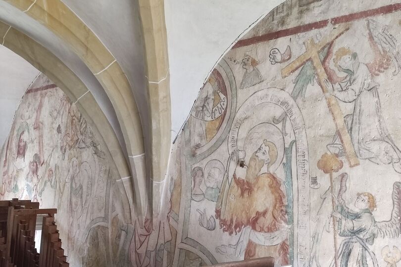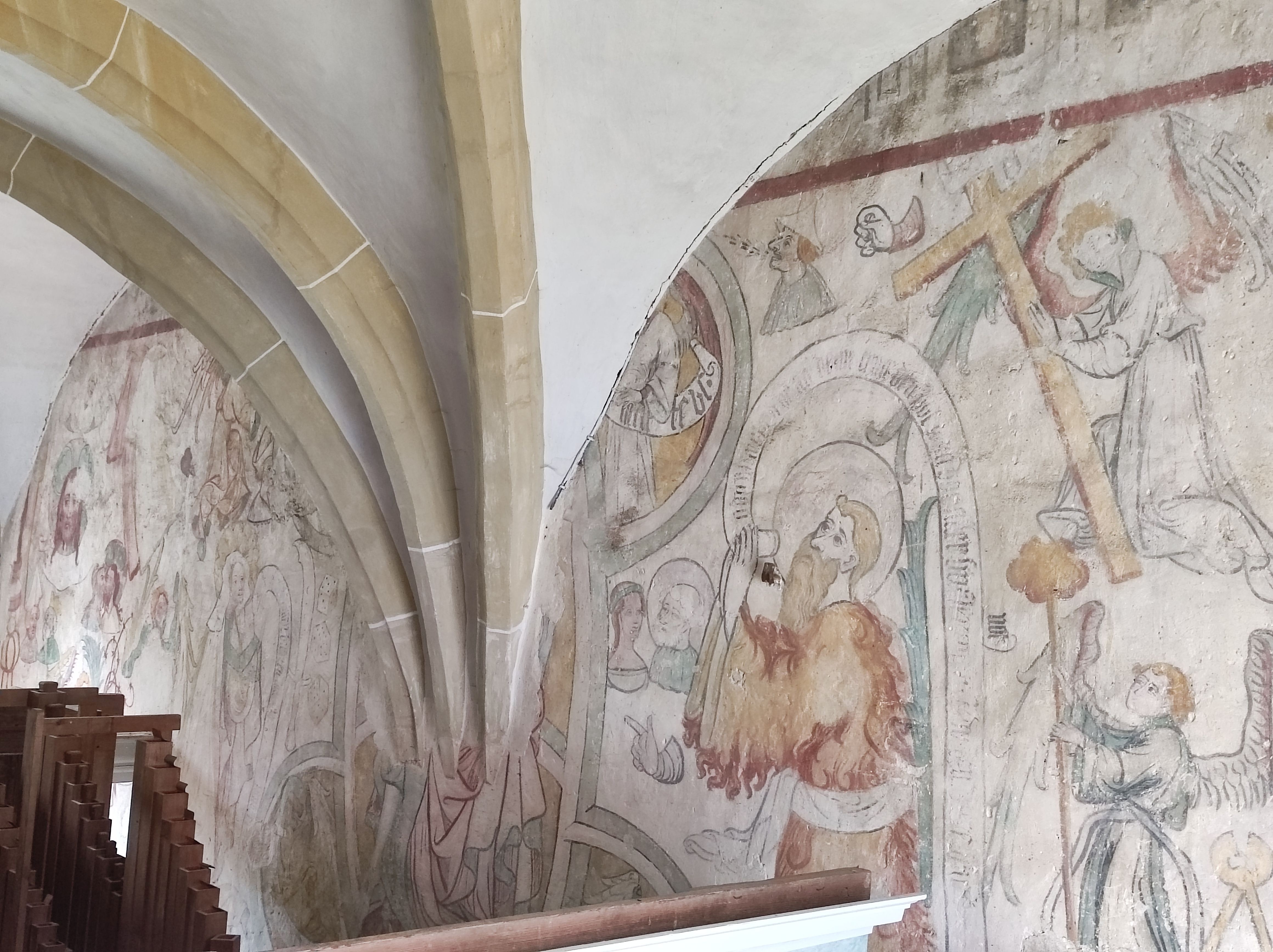 Auch heute noch machen in der Kirche zwei markante Zeugnisse den damaligen Traditionsbruch deutlich: für die vorreformatorische Zeit zeugen die Reste der wunderbaren figürlichen Ausmalung auf der fensterlosen Wand hinten im Kirchenschiff, für die Zeit nach der Reformation das Gewölbe mit den drei Pfeilern, welche mitten ins Kirchenschiff gesetzt wurden.